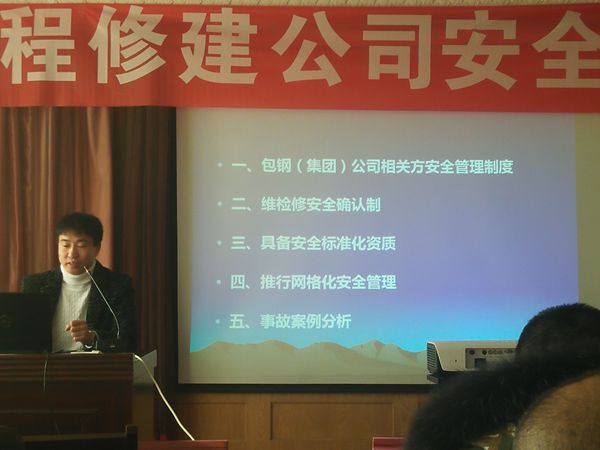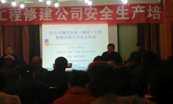于2019年1月9上午8點,集團公司聯(lián)合工程修建公司進行為期一天的安全培訓,特邀請包鋼集團公司生產(chǎn)部張鋼和康寶慶(注冊安全工程師 二級安全評價師)為各單位安全員進行安全培訓。